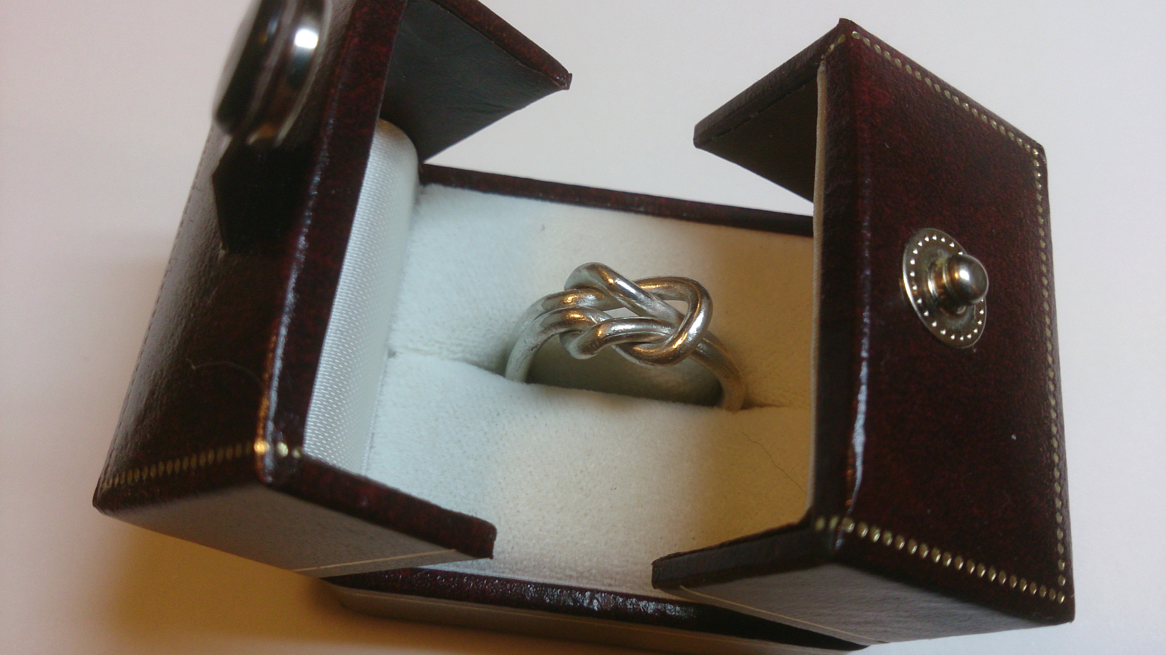 En el mon del metall, percebo que fa una particular gracia ensenyar coses que a priori semblen imposibles per la propia natura del material. Paradigma d´això son els nusos, que criden fortament la atenció fets amb qualsevol metall. En tinc un de veritat, fet amb la forja, a una barra d´acer de 10 mil.limetres de gruix, i va ser finalment un canelobre. Acabo de caure que no és al blog. El posaré. Aquest anell de plata de llei es fals en aquest sentit, en tant que està fet amb la técnica de la cera perduda. Tot i ser una creació una mica vista, em feia il.lusió fer-la.