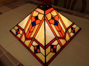 Comparteixo avui, de nou, una cosa inacabada. El seguent projecte de vitrall, també amb la tècnica Tiffany. Un llum de sostre amb el sistema Tiffany, aquest amb un disseny art decó. Us ensenyo la primera de les cuatre cares que tindrà, acabada ahir. El llum tindrà forma de piràmide truncada invertida. Mes endevant, quan estigui acabada us la ensenyaré, encesa i tot. Espero que us agradi com pinta.