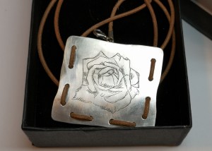 Com cada any tocava fer alguna cosa per la Diada de Sant Jordi, i també com es tradicional havia de ser una rosa. Aquest cop aquest penjoll, en plata, que vaig gravar l´any passat quan feia el curset de gravat amb burí. La peça ha estat enfosquida, i, crec, enriquida per la disposició del collaret de cuir amb que l´he montada. De fet aquest any he regalat dos, de roses, la propera la publicaré dilluns que ve.