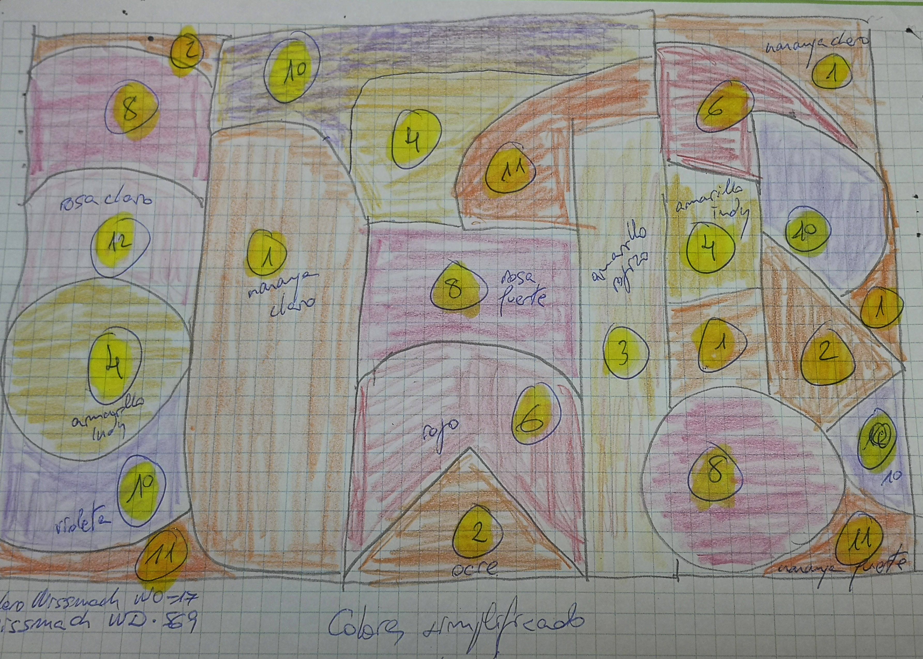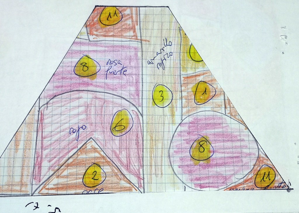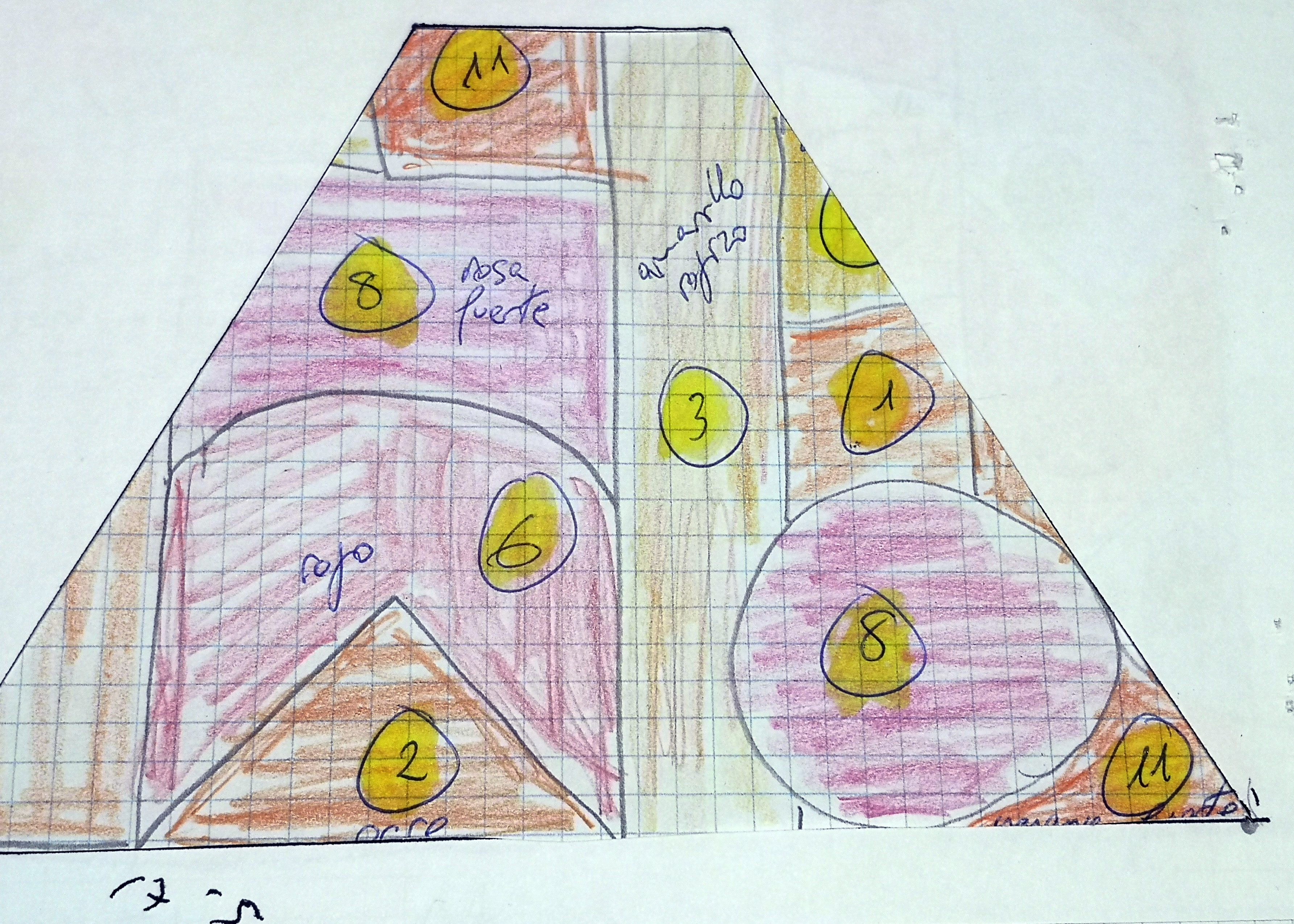 Vaig començar per fer un dibuix que amb els seus colors i formes em semblés prou interessant, i bastant mes gran que el que tindrien que ser les cares a confeccionar.Després amb una fulla on vaig retallar la forma de plantilla que m´interessaba, la vaig superposar succesivament a diferents llocs del dibuix inicial. La fotocopia a color de cada una d´aquestes quatre superposicions va donar cada una de les quatre cares a fer. Amb un aire molt familiar, pero cada una d´elles diferent a les altres.