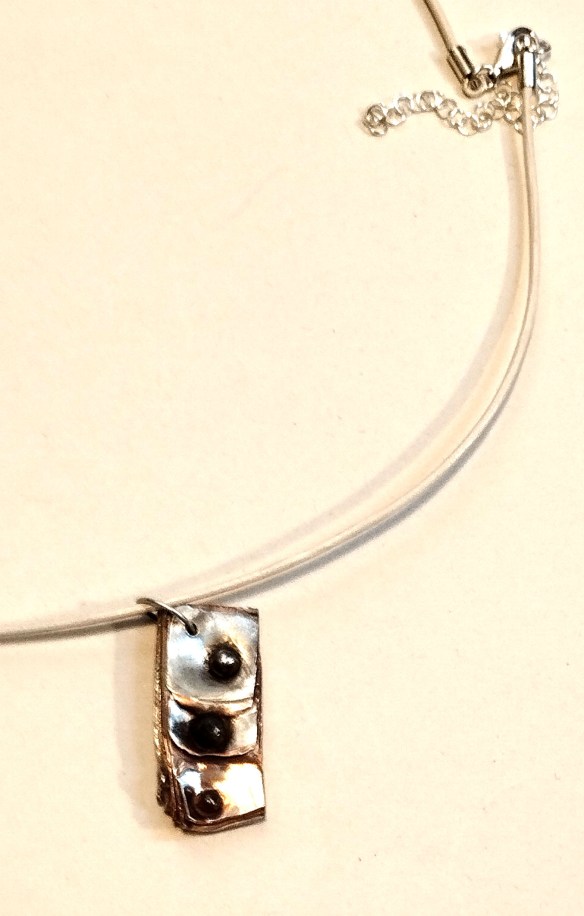 Una peça de mokume gane, en la que s’aprecien les diverses fulles que el componen, a la que per buscar formes diferents, vaig aplicar pressió amb la premsa, i col·locant unes petites esferes d’acer.