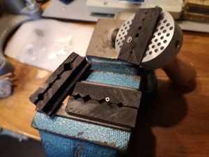 Aquesta entrada va per temes de clavat de pedres. Quan s´engasta una pedra a l´extrem d´un tub d´argent, el tub es fica en calent en  una pasta de clavat, una especie de lacri, i així queda fix per poder fer força sense que perilli la pedra ni la plata.  Aquest cop volia posar una pedra a un extrem del tub, i un altra a l´altra extrem. La primera, cap problema, pero al posar el tub a la pasta per col-locar la segona, el tub i la primera pedra s´embrutarien amb la pasta de clavat, i potser no podria netejar-les be. Recorrer a una mordassa normal, exclòs, ja que deformaria el tub o podria danyar la pedra. Per això he fet aquests suplements de mordassa amb una especie de plastic dur, o nylon mecanitzable (delrin)  amb la fresadora, amb els que es molt mes improbable que faci malbé els tubs. Tenen un tamany que serveix per la mordassa de mà com per la de bola, fins i tot per una de taller, com podeu veure a la foto, i poden tenir altres utilitats.