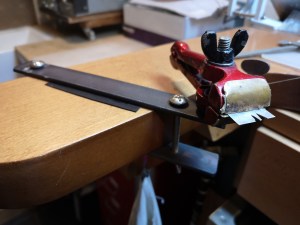 Podeu veure que la mordassa vermella es orientable en la direcció que convingui per serrar. I, fins i tot, amb un petit angul, de 40x40x4 mm es podria anclar la mordaça a la mateixa peça per treballar amb la peça en vertical. La cosa negra que es veu sota les pletines es plàstic per evitar que la fusta del banc resulti danyada al apretar el conjunt.