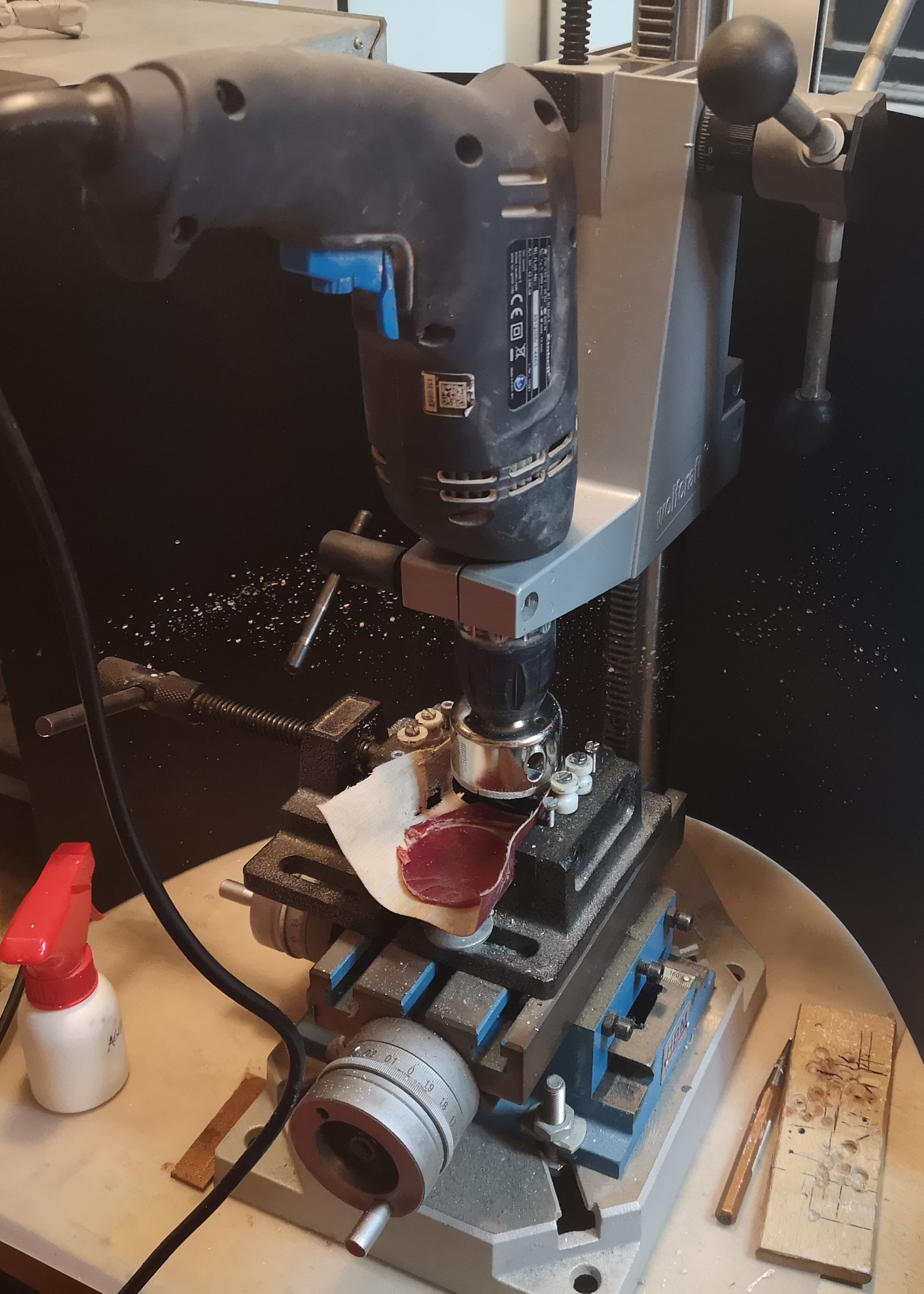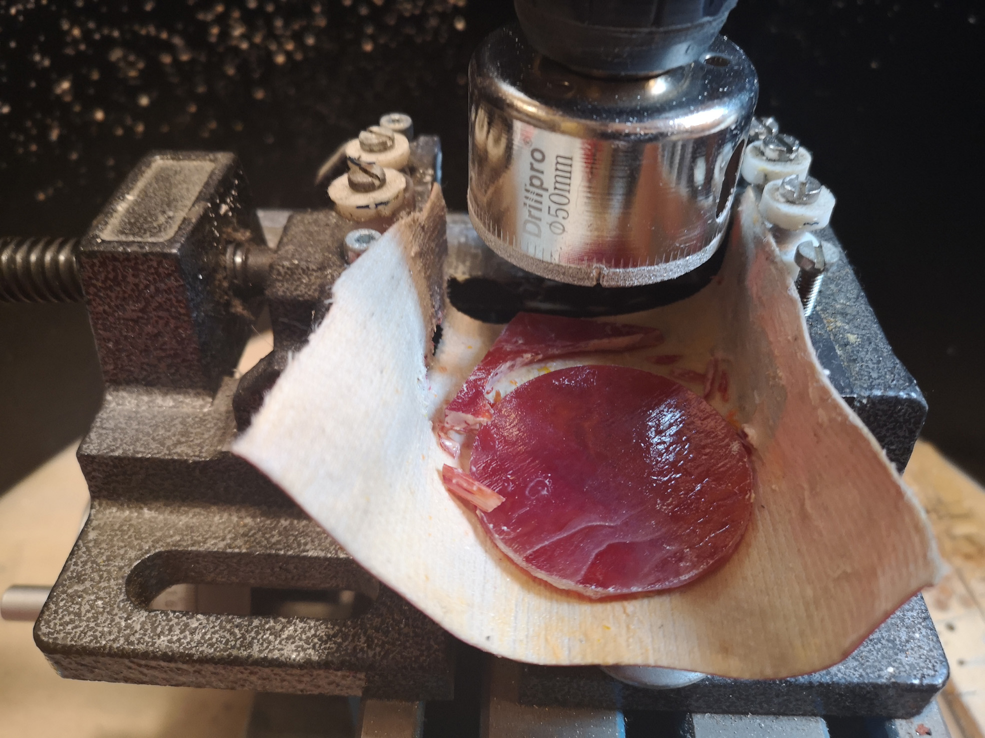 Perforar minerals amb broques de diamant o metall dur, submergides en aigua, amb trepant de columna, no té massa secret per qualsevol que s’hagi preocupat de trencar un petit capital en broques en l’intent. En aquest post vull posar en relleu, del meu sistema, per si a algú li fa servei, uns detalls concrets. D’una banda he fet servir un cassó, de 16 cm de diàmetre, de mànec, del ikea, que crec que va costar uns 5 euros, retallat a la meitat amb radial i polit posterior de la vora. Com que aquests cassons tenen un fons d’acer molt gruixut, per ser útils per les cuines d’inducció, amb quatre imants de neodimi, el cassó queda molt fortament subjecte a la mordassa, i es pot omplir tranquil·lament d’aigua a la meitat amb la seguretat que no s’abocarà. Aquesta mida de cassó és prou gran per poder ficar els dits, enguantats o no, per subjectar la peça amb prou comoditat.
