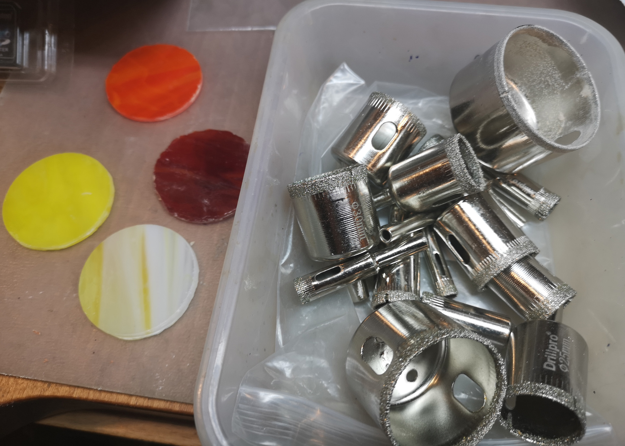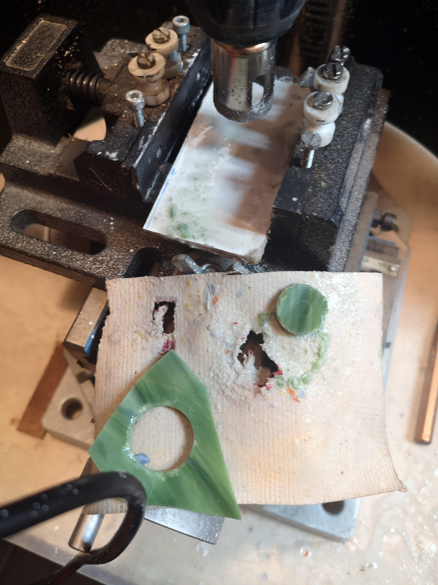 Efectivament, com es pot veure a les fotografies, amb un trepant senzill, posat en una columna de bricolatge, i posant el vidre a la mordassa, protegit amb un tros d´skay o de cautxu, amb un trosset de fusta a sota, i pulveritzant aigua amb un espray, s´obtenen cercles amb molta facilitat.  Vaig usar una velocitat mes aviat lenta. Aquesta va ser la primera prova, i no es va trencar ni un cercle. Fins i tot, en el cas dels petits, quedava la peça exterior sencera, válida per alguna altra cosa, per exemple posar algun cercle de diferent color en mig.