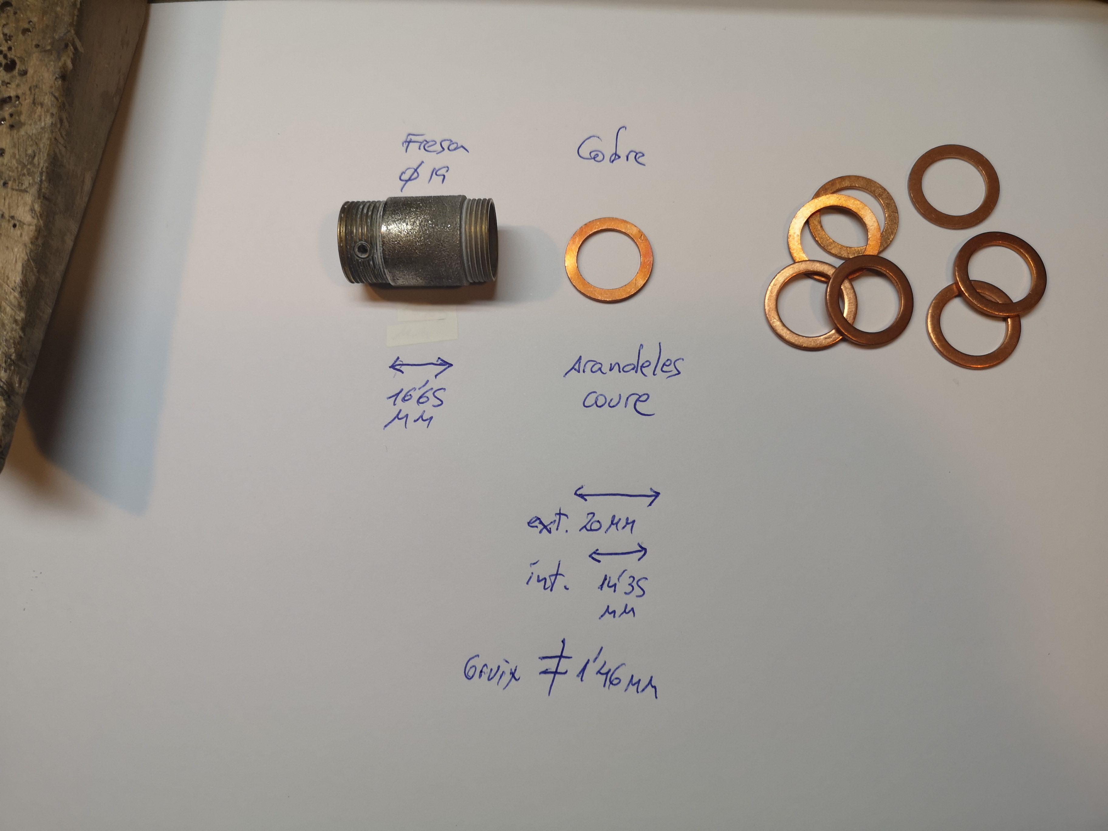 El cobre, o el nylon resisten el agua perfectamente y por esto son materiales ideales. Ignoro si se pueden hallar de las medidas que nos interesan en los comercios, de nylon, pero de cobre si que existen. En la foto pongo las medidas que he tomado, y en la otra se aprecian las arandelas que tengo ya puestas en mi máquina.