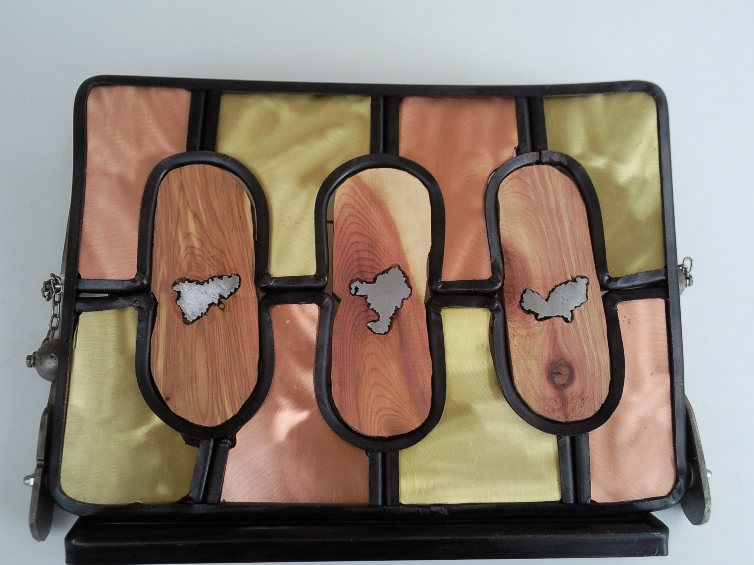 Com sabeu molts, faig de tant en tant escapades a coses que no son joieria…forja o altres metalúrgies, lamentablement no tant sovint com voldria. Aquesta peça la vaig fer l´any passat, i reconec que m´ha quedat una cosa molt rara. La ceràmica central son dos peces d´antiquari, del segle XIX, ja així enmarcades, que vaig comprar a una amiga en una subhasta. Em vaig enredar a afegir-hi peces metaliques (son perfils de planxa d´acer, llautó i alumini fresats), i de cop em van fer adonar que estava fent una espècie de quadre al revés, cap a fora. Tot i això m´agrada el resultat, i està penjat al menjador de casa amb diversitat d´opinions per part dels moradors. Espero que us agradi.
