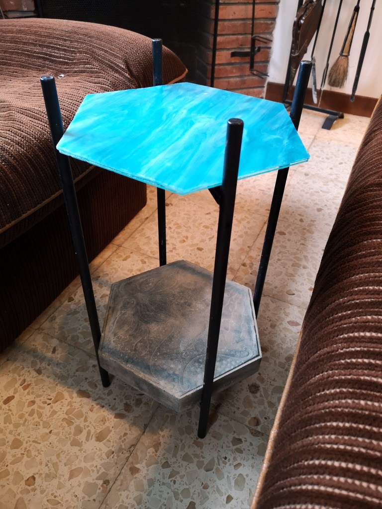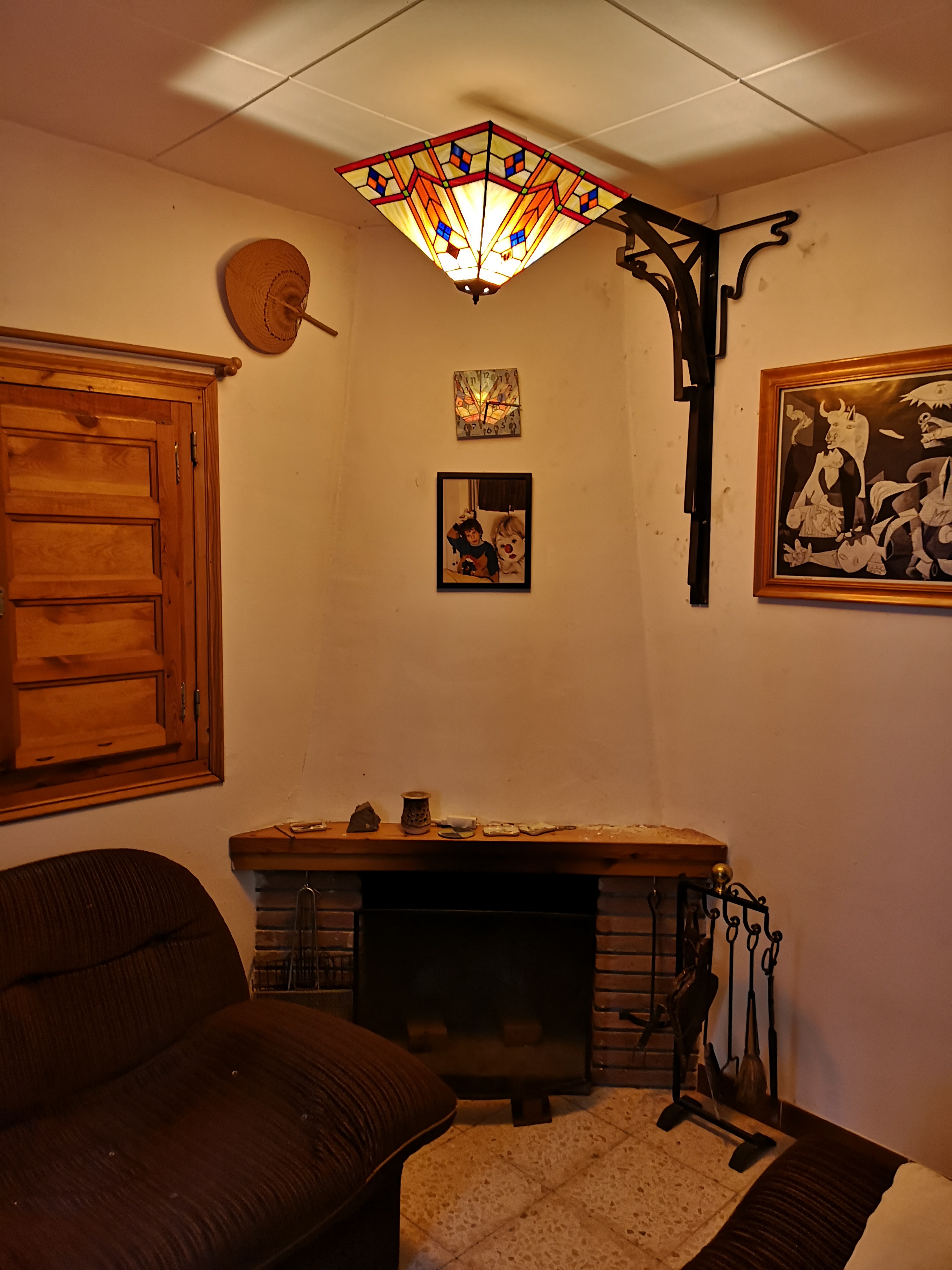 Una suggerencia de la Charo -a qui no debia agradar gaire el moble de la tele que teniem-, de fer-ne un altre, de forja, va portar, despres de força temps de imaginar sense exit com adaptar una forma de tipi indi a moble de racó, a realitzar aquest disseny. Perque es veies mes lleuger les lleixes son de vidre. La sobrietat del resultat, em va portar a afegir , fets amb fang, els simbols del sistema solar.