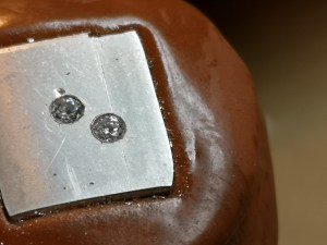 He de reconeixer que aquesta potser es la entrada mes sosa de totes les que he publicat, pero em fa il-lusió posar-la. Estic fent un curset de clavat (engastat) de pedres, i son les primeres que consegueixo deixar raonablement be. Es un exercici de clavat a nivell sobre planxa de plata, de dos zircònies de 2,5 mm. Com qualsevol exercici la plata està agafada amb una pasta de clavador sobre un fus de fusta, i no està ni pulida.