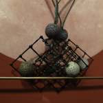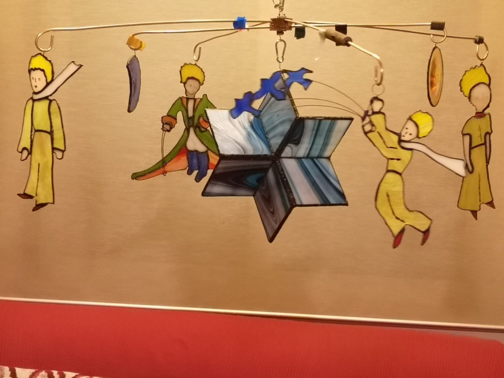 Les sabates femenines i daurades recolzen l’estructura de la banqueta de ferro i vitralls de colors divertits i fresquets que, rodons, semblen confetis. Atrauen l’ull humà amb poder alegre de seducció. Petits i grans es toquen entre si, creant cercles concèntrics i una estrella romboidal, que convida a seure-hi per entrar en un món imaginari com si es tractés d’un calidoscopi.