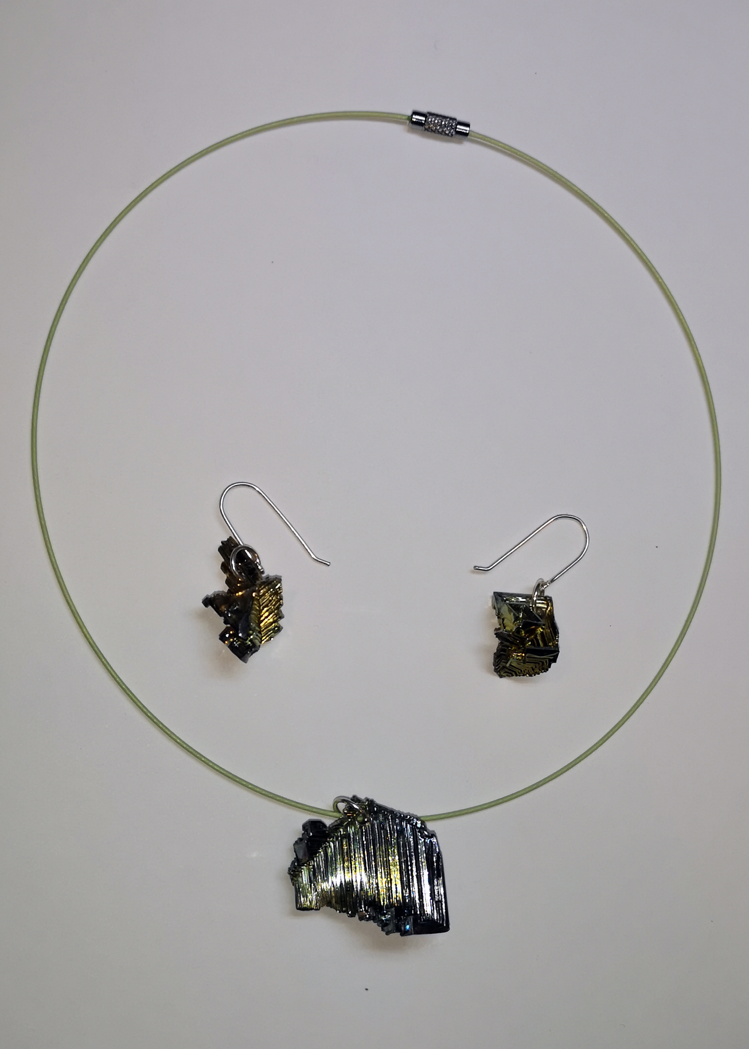 Avui comparteixo aquest conjunt de penjoll, arrecades i fermall que vaig fer   seguint la idea de les notes musicals que ja havia publicat.  Amb plata i esmalt transparent. El pentagrama, que inicialment anava amb collaret senzill, finalment va quedar reforçat amb aquesta cadena, que barreja trams de diversos colors de pell de cabra, amb trams de cadena de cua de ratolí coberts per malla de plata, i li dona singularitat al conjunt.
