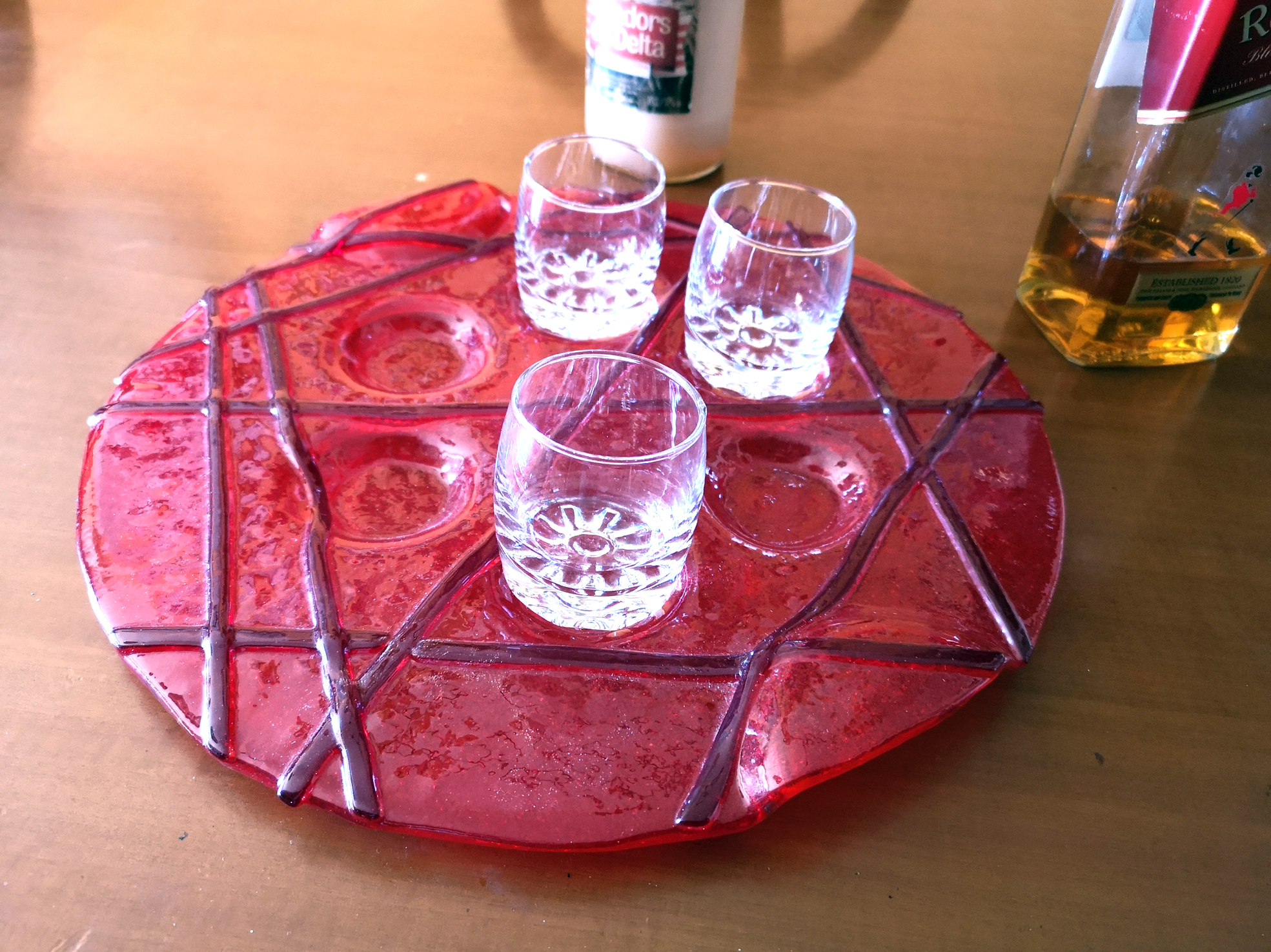 Aquestes peces son fetes amb vidre per tiffany, transparent, que cuit al forn queda fos amb la plata que li fa de cassoleta.