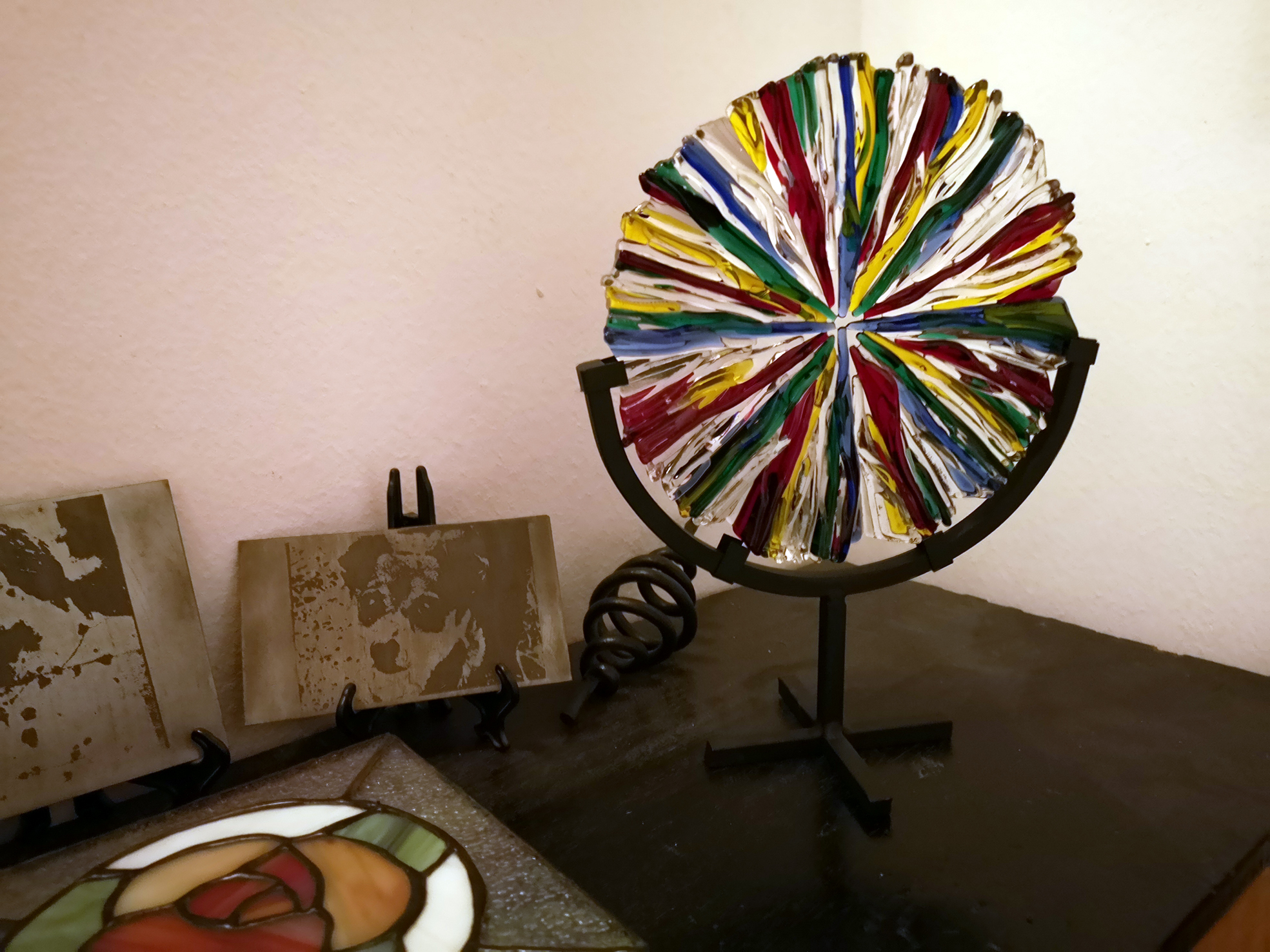Aquest disc multicolor està fet amb vidre transparent y de colors, amb la tècnica del fusing, amb el forn, que li dona aquesta preciosa textura líquida. Es una petita escultura sense mes utilitat que la decorativa. Encara que el publico ara per questions d agenda, el vaig fer la passada primavera. Espero que us agradi.